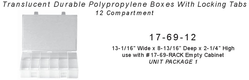 Storage Box, Quik-Select 11 Comprartment Box, 12 Compartments. Translucent Durable Polypropylene Boxe with Locking Tabs. Size 13-1/16” Wide x 8-13/16” Deep x 2-1/4” High. Can use with Auveco # 69-RACK Empty Cabinet