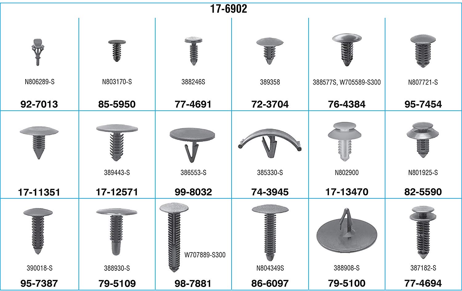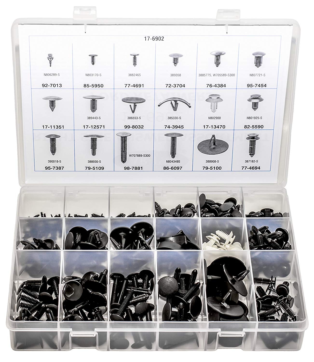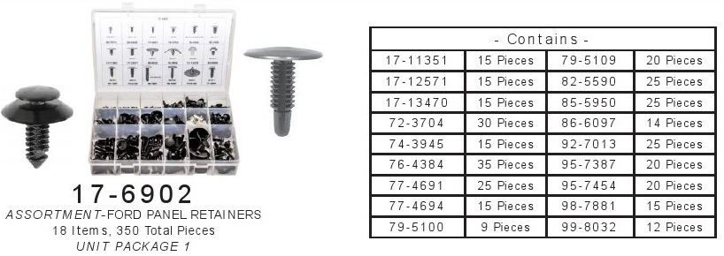 -Ford Push-Type, Right Size” Answer Assortments, Contains 18 Items, 350 Pieces, Contains These Numbers # 17-11351, 79-5109, 17-12571, 82-5590, 17-13470, 85-5950, 72-3704, 86-6097, 74-3945, 92-7013, 76-4384, 95-7387, 77-4691, 95-7454, 77-4694, 98-7881, 79-5100, 99-8032. In Translucent Durable Polypropylene Boxes With Locking Tabs, Size 13-1/16” Wide x 8-13/16” Deep x 2-1/4” High, use with #17-69-RACK Empty Cabinet (Will hold 5 “Right Size” Assortments)