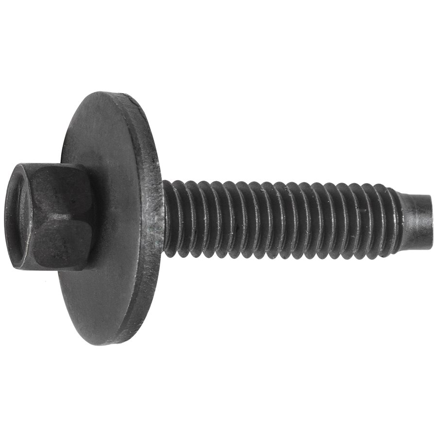 Ford, Body Bolt, Hex Head SEMS Screw with Loose Washer & Dog Point, Black Phosphate. M6-1.0 x 28mm, Hex 8mm, Washer Diameter 19mm, Class 9.8. Ford # N606677-S