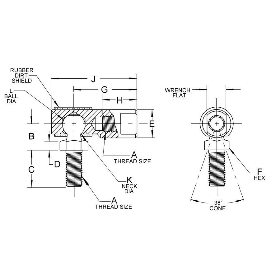 Ball Joint Assembly with Dirt Shield, “Flat Top” with Rubber Grommet, Screw Size 7/16-20, Overall Length 2.375, Internal Thread Length 1.125 (R), Ball Center to Base of Hex .875, Ball Center to Housing End 1.937, Ball Stud Neck Diameter .412, Stud Length 1.125, Stud Hex Width .250, Shank Diameter .750, Wrench Width .625. Material made from Low Carbon Steel, Case Hardened with Zinc Plated Clear Dichromate Treatment. Only available fully assembled.