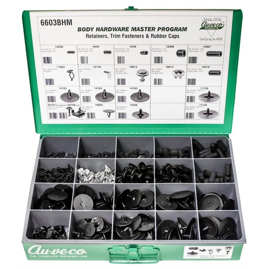 Hood Insulation Retainers, Trim Panel Fasteners & Rubber Vacuum Caps, 16 Varieties, 440 Pieces. Contains the following Auveco Part Numbers: 4439, 4440, 11863, 11130, 12134, 12209, 12210, 12907, 12908, 14163, 15456, 19613, 19614, 19655, 20757 & 20758. Comes With Steel Drawer