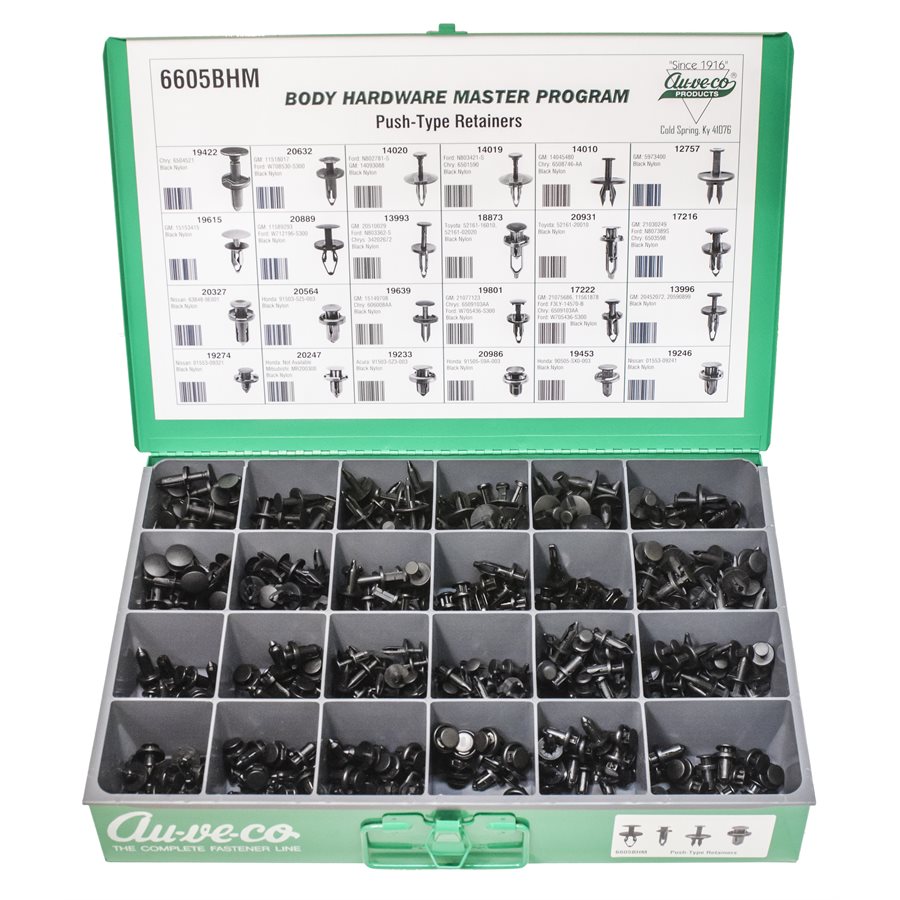 Push-Type Retainers, 24 Varieties, 492 Pieces. Contains the following Auveco Part Numbers: 12757, 13993, 13996, 14010, 14019, 14020, 17216, 17222, 18873, 19233, 19246, 19274, 19422, 19453, 19615, 19639, 19801, 20247, 20327, 20564, 20632, 20889, 20931 & 20986. With Large Steel Drawer