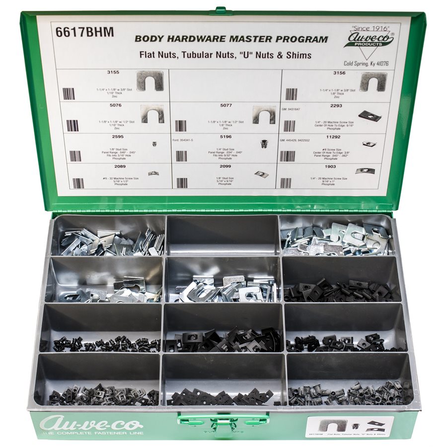 Flat Nuts, “U” Nuts, Tubular Nuts & Shims, 11 Varieties, 950 Pieces. Contains the following Auveco Part Numbers: 1903, 2089, 2099, 2293, 2595, 3155, 3156, 5076, 5077, 5196 & 11292. Comers With Steel Drawer