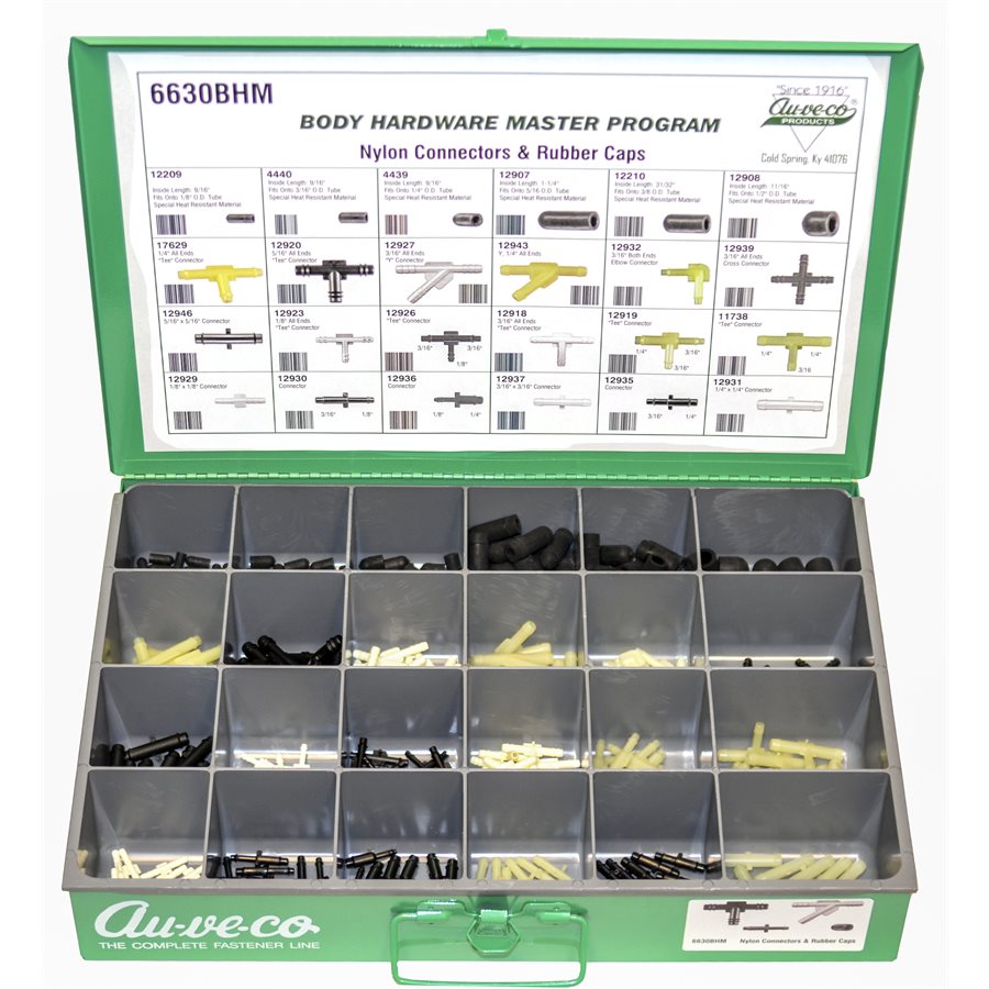 Nylon Connectors & Rubber Caps. 24 Varieties, 310 Pieces. Contains the following Auveco Part Numbers: 12929, 12930, 12936, 12937, 12935, 12931, 12946, 12923, 12926, 12918, 12919, 11738, 17629, 12920, 12927, 12943, 12932, 12939, 12209, 4440, 4439, 12907, 12210, 12908. Comes With Steel Drawer