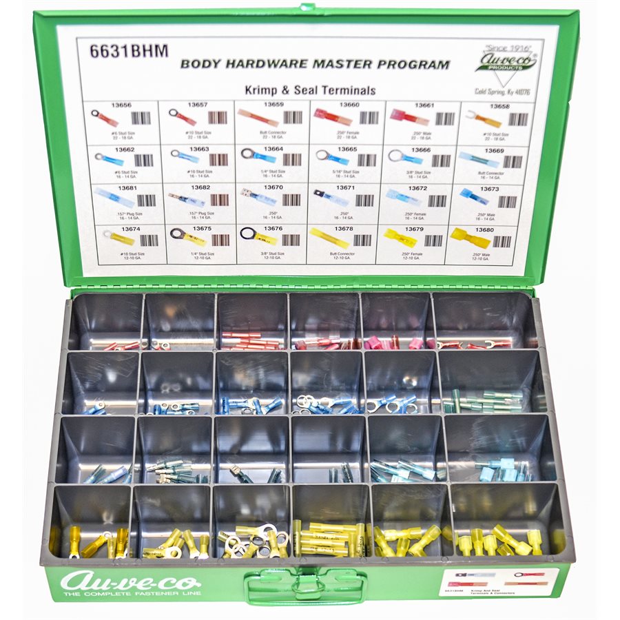 Krimp & Seal Terminals & Connectors, 24 Varieties, 240 Pieces. Contains the following Auveco Part Numbers: 13656, 13657, 13658, 13659, 13660, 13661, 13662, 13663, 13664, 13665, 13666, 13669, 13670, 13671, 13672, 13673, 13681, 13682, 13674, 13675, 13676, 13678, 13679, 13680. Comes With Steel Drawer