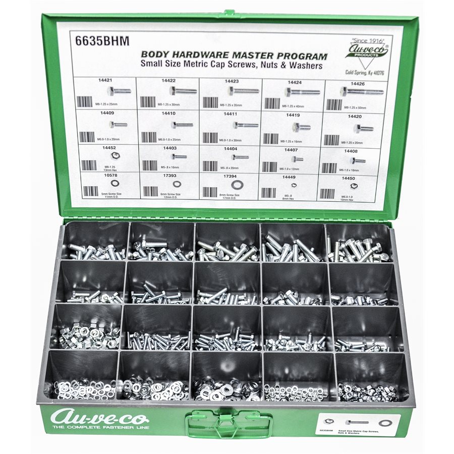 Small Size Metric Cap Screws, Nuts & Flat Washers, 14 Varieties, 925 Pieces. Contains the following Auveco Part Numbers: 14403, 14404, 14407, 14408, 14409, 14410, 14411, 14419, 14420, 14421, 14422, 14423, 14424, 14426, 14449, 14450, 14452, 10578, 17393, 17394. Comes With Steel Drawer