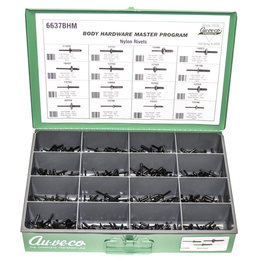 Nylon Rivets, 16 Varieties, 475 Pieces, Contains the following Auveco Part Numbers: 20754, 13746, 13747, 13748, 13755, 14004, 13752, 13753, 18502, 13750, 17101, 18108, 21028, 13751, 15490, 14023. Comes With Steel Drawer.