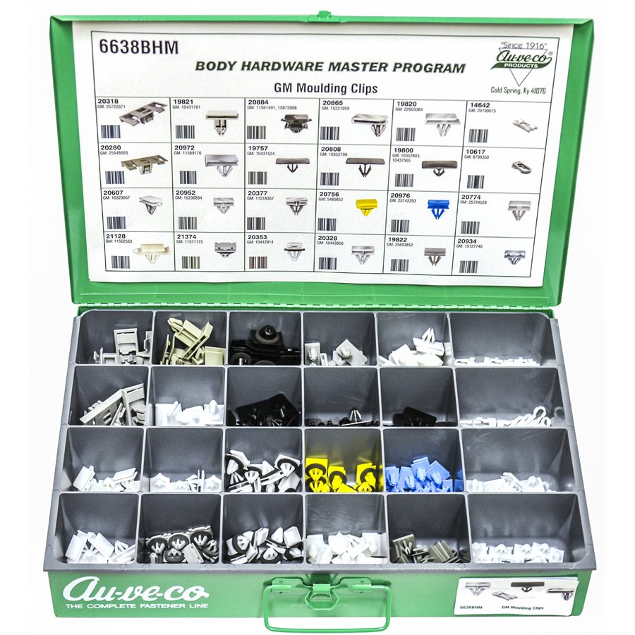 GM, Moulding Retainer Clips, 24 Varieties, 415 Pieces, Contains the following Auveco Part Numbers: 10617, 14642, 19757, 19800, 19820, 19821, 19822, 20280, 20318, 20328, 20353, 20377, 20607, 20756, 20774, 20808, 20865, 20884, 20934, 20952, 20972, 20976, 21128 & 21374. Comes With Steel Drawer.