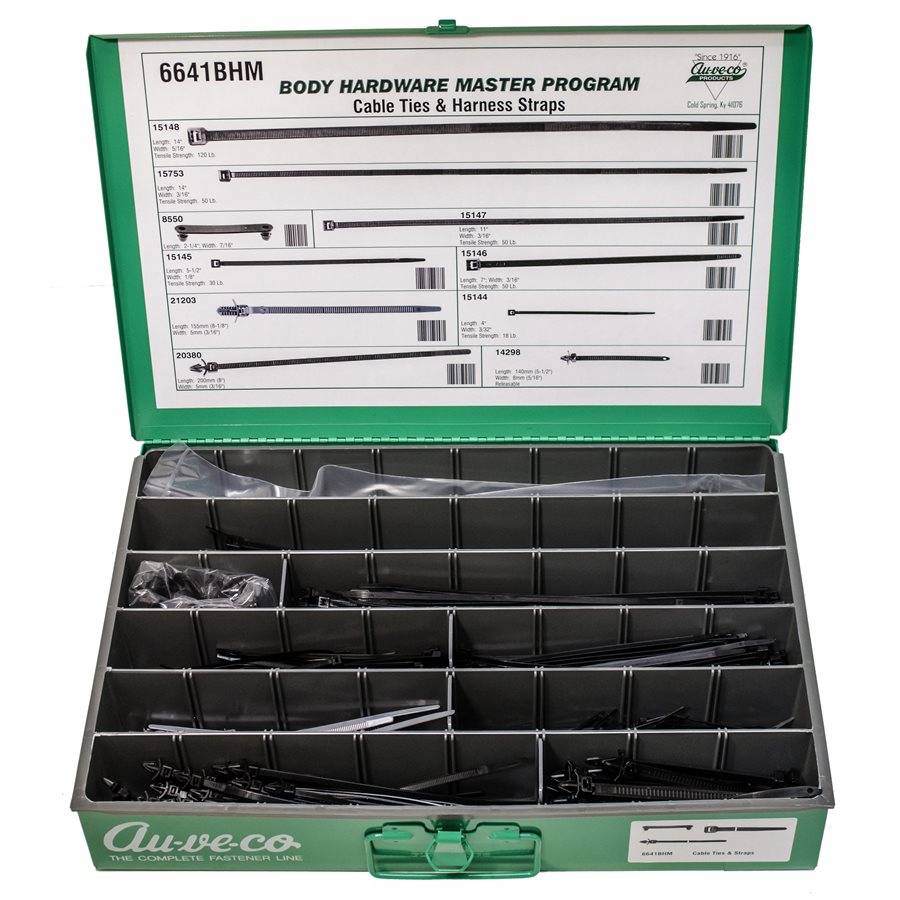 Cable Ties & Straps, 10 Varieties, 575 Pieces, Contains the following Auveco Part Numbers: 8550, 14298, 15144, 15145, 15146, 15147, 15148, 15753, 20380, 21203. Comes With Steel Drawer.
