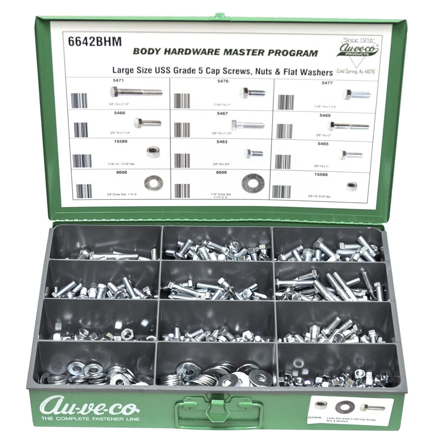 Large Size USS Grade 5 Cap Screws, Nuts & Flat Washers. 8 Varieties, 650 Pieces. Contains the following Auveco Part Numbers: 5463, 5465, 5466, 5467, 5469, 5471, 5476, 5477, 15588, 15589, 8608, 8609. Comes With Steel Drawer