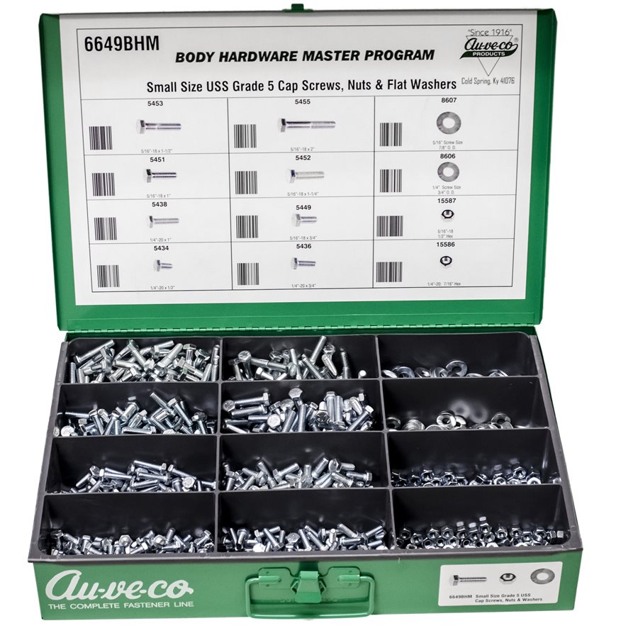 BODY HARDWARE MASTER METAL DRAWER ASSORTMENT, Grade 5 USS, Cap Screws, Nuts & Washers, 8 Varieties, 1,150 Pieces. Small Size Drawer, Contains Auveco # 5434* 1/4″-20 x 1/2″, 5453 5/16″-18 x 1-1/2″, 5436* 1/4″-20 x 3/4″, 5455 5/16″-18 x 2″, 5438* 1/4″-20 x 1″, 15586 1/4″-20 Hex Nut, 5449* 5/16″-18 x 3/4″, 15587 5/16″-18 Hex Nut, 5451* 5/16″-18 x 1″, 8606 1/4″ USS Washer, 5452* 5/16″-18 x 1-1/4″, 8607 5/16″ USS Washer, *Threaded to the Head