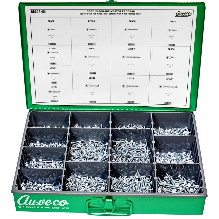 Body Hardware Master Asst. Drawer, Description : Square Drive Pan Head Teks® Screws with White Painted Head, Includes : 13 Varieties – 1,300 Pieces, Auveco offers more than 40 prepackaged Fix-Kits in the 6500 series large drawer. Each drawer measures 18” wide x 12” deep x 3” high. Each drawer’s compartment is designed to hold the entire contents of one or more standard Auveco unit packages. Printed lid labels identify the correct Auveco part number for ordering refills.