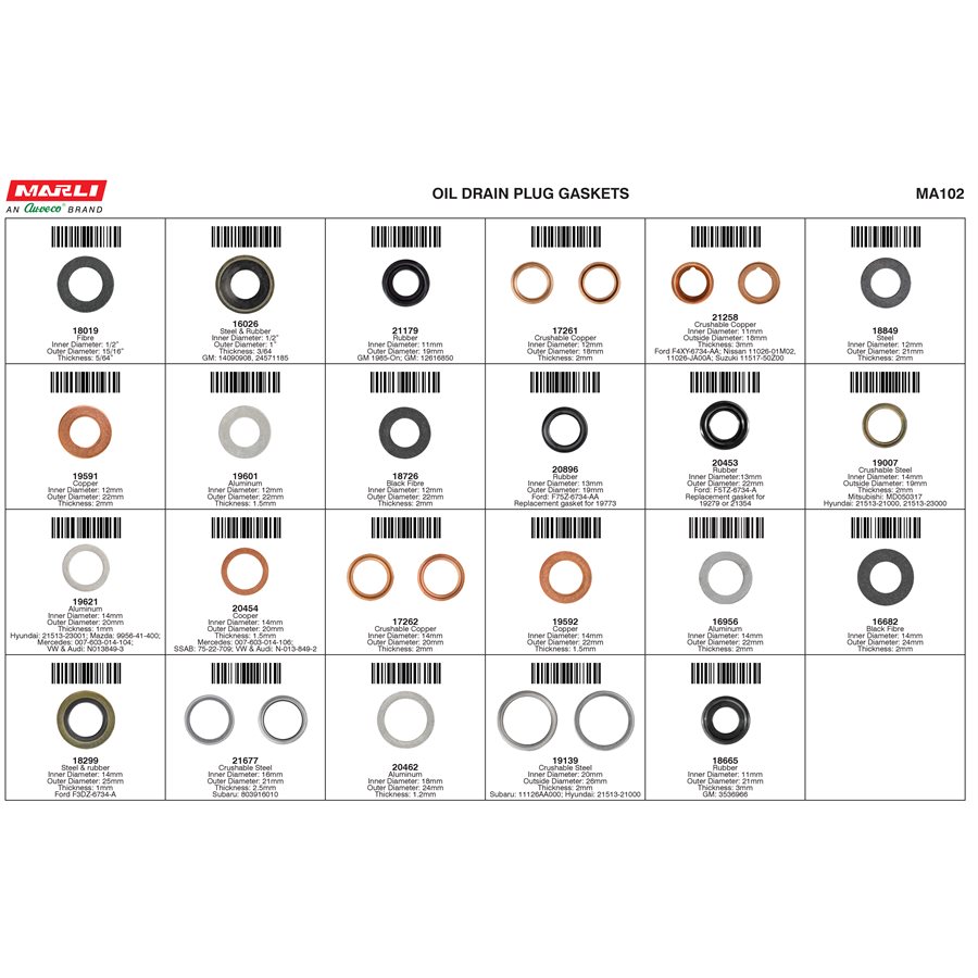 Assortment Kit, Pre-Loaded Drawer Assortment, Metal Compartment Drawer, Large. Oil Drain Gaskets. Includes 23 Varieties, 490 Pieces. Includes # 18019, 16026, 21179, 17261, 21258, 18849, 19591, 19601, 18726, 20896, 20453, 19007, 19621, 20454, 17262, 19592, 16956, 16682, 18299, 21677, 20462, 19139, 18665