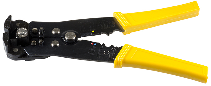 Wire Stripper/Crimping Tool, Self-Adjusting, The quick and easy way to strip wire. Unique steel jaws self-adjust to strip any wire 26-10 gauge. Only light handle pressure is needed to make wire stripping fast and easy., Crimps insulated and non-insulated 22 to 10 gauge and 7mm/8mm terminals Also features precision machined blade for cutting wire sharp and smooth. Overall Length: 8-1/4″