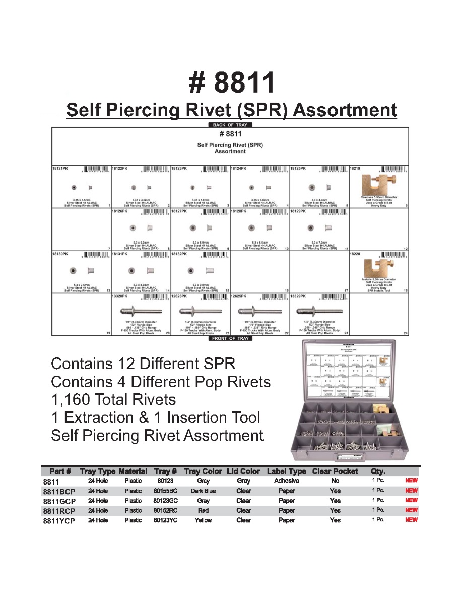 Self Piercing Rivet Assortment, Contains 12 Different SPR Rivets Sizes And 4 Different Pop Rivets, 1,160 Total Rivets, 1 Extraction Tool & 1 Insertion Tool. Comes With Drawer